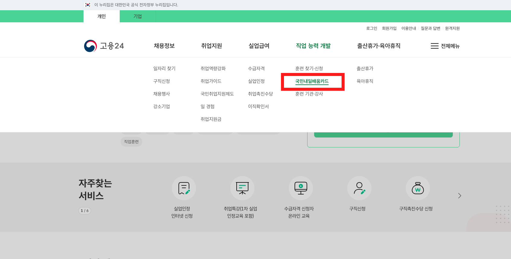 직업능력개발 메뉴에서 내일배움카드 선택